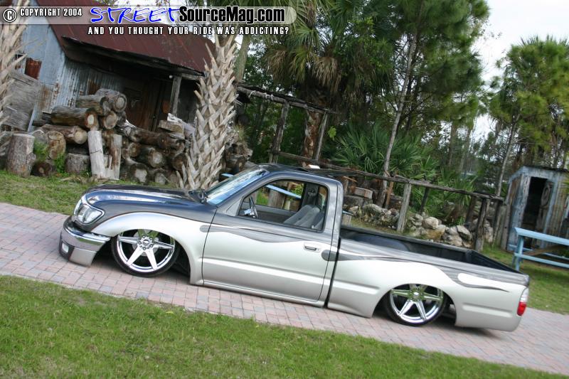 For ups, Firestone 2500 bags would be installed at all 4 corners. Not yet low enough for Tony's taste, Shaune would then need to move the master cylinder up a bit and relocate the battery into the bed for the 4-inch body drop. The firewall would then be tubbed to allow more room for the 19's. After layin' rocker this beast still has A/C, which is a necessity for every day driving in Florida. Finishing the bed set up and suspension, a molded notch cover with RAW logo would be added and sprayed over by a Linex spray-on system.