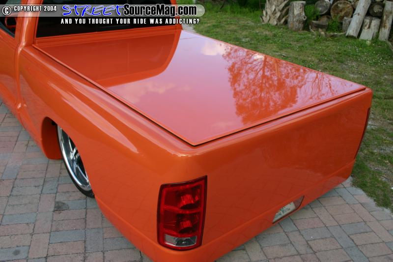 Taking on the sides, the emblems, door handles and antenna would all be shaved while the gas filler door was relocated into the bed. The taillights would be junked and a set of 2004 Dodge Ram tails would be fitted in their place. The mirrors would be shaved and replaced with a flamed chopper style mirror to help finish off the side work.