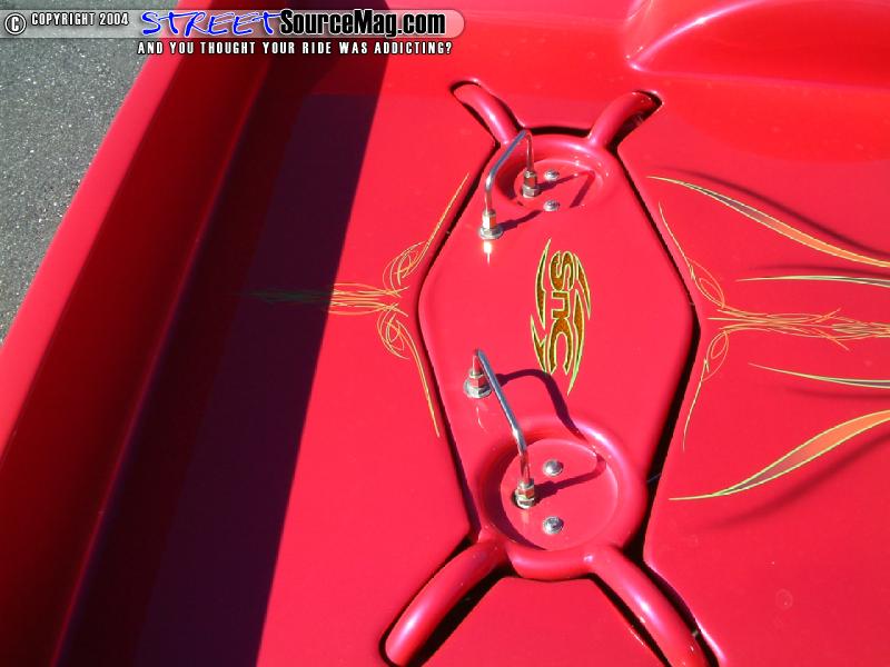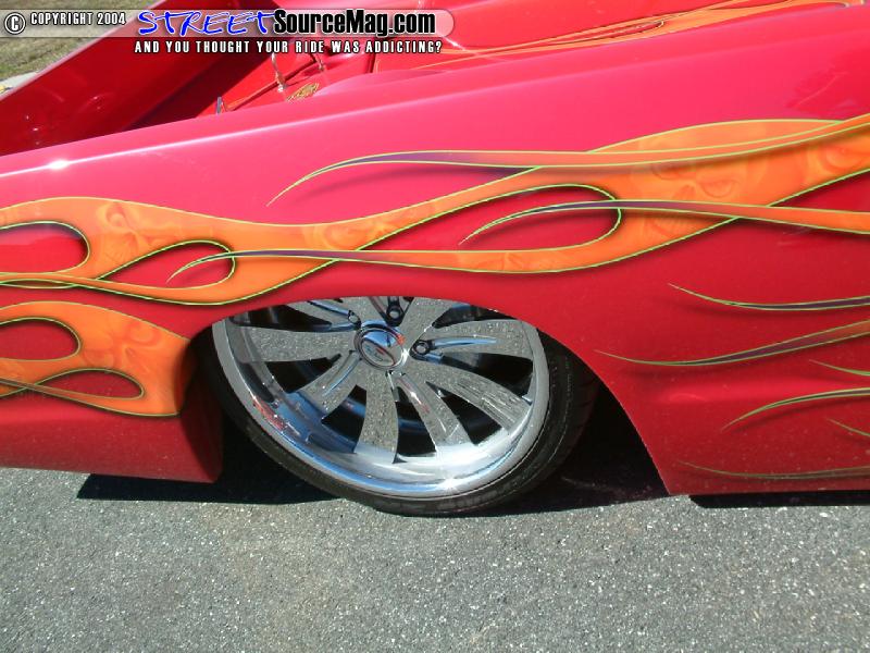 four RS-72 Slam Specialty bags, 8 nickel plated GC Valves, 2 VIAIR 450’s filling the air tank which would be the frame holding up to 7 gallons. Stainless steel airline would then be ran throughout. Not yet finished they would then build a custom cross-member for the air ride housing an “SNC” flush molded with an orange lens and then striped in HOK lime green as well as the logo being a light. With the suspension in place the S10 would now tuck the 20x8.5 Chrome Boyd Coddington Turbines with 245/35R20 Nitto tires.