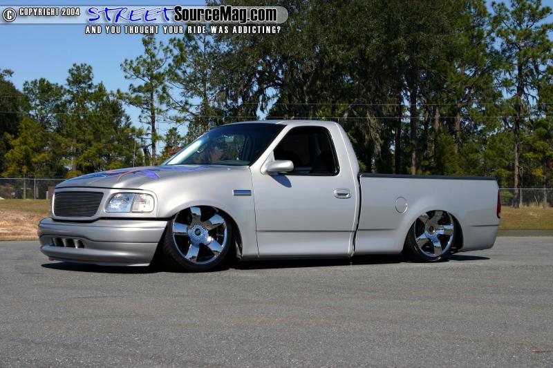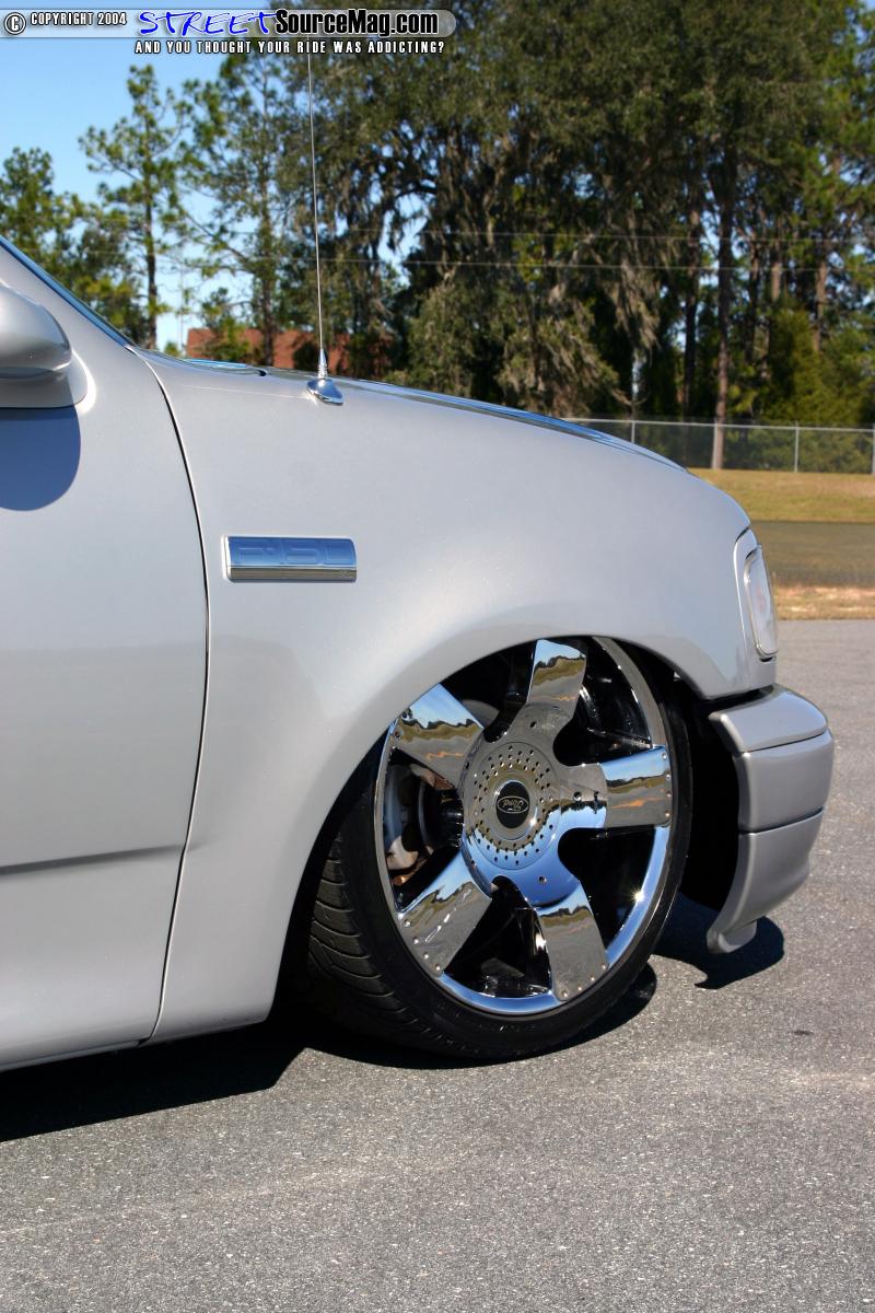 Matt’s F150 rolls on a notched frame by Bulletproof Fabrication and air bags on all four corners, and features nitro drop shocks, notched firewall, and a 6 link canti setup by KD Components. Matt’s truck airs up courtesy of an engine driven compressor. The battery was relocated under the bed and the stock gas tank was sectioned to fit. Matt’s truck tucks the massive 22” KMC Thunders.