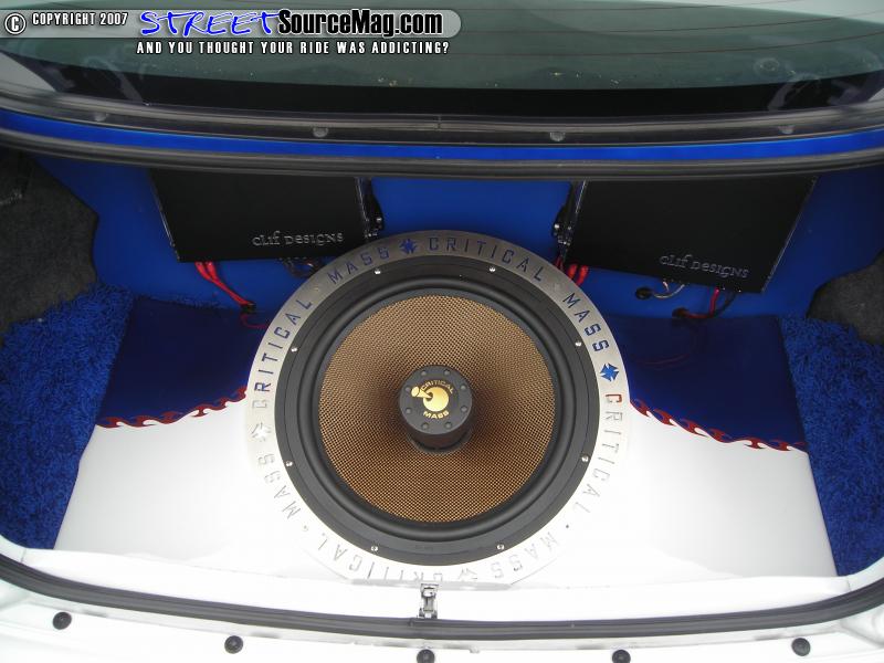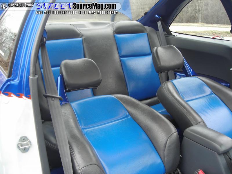 One of the first stops for this Civic was Garrett Upholstery in Van Buren. There the seats were recovered in blue & gray marine vinyl. The door panels and rear deck were also covered to match. Some blue matching carpet was then laid down and Steve Rogers of S&L Body Shop made some final touches with his spray gun. Some of the accessories added were an Indiglo blue gauge overlay, billet rearview mirror, billet window cranks & flamed Inferno billet steering wheel from B.A.D.