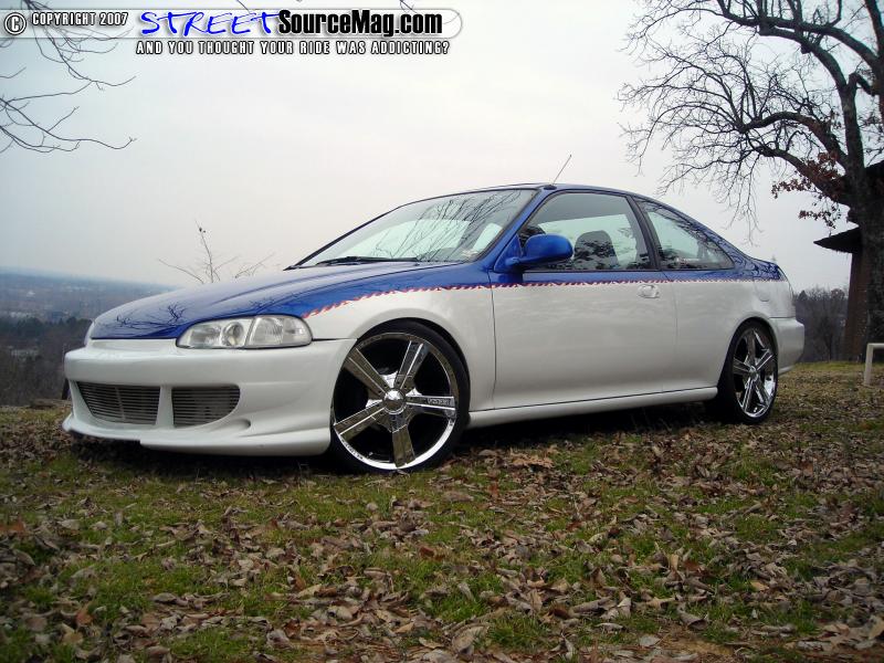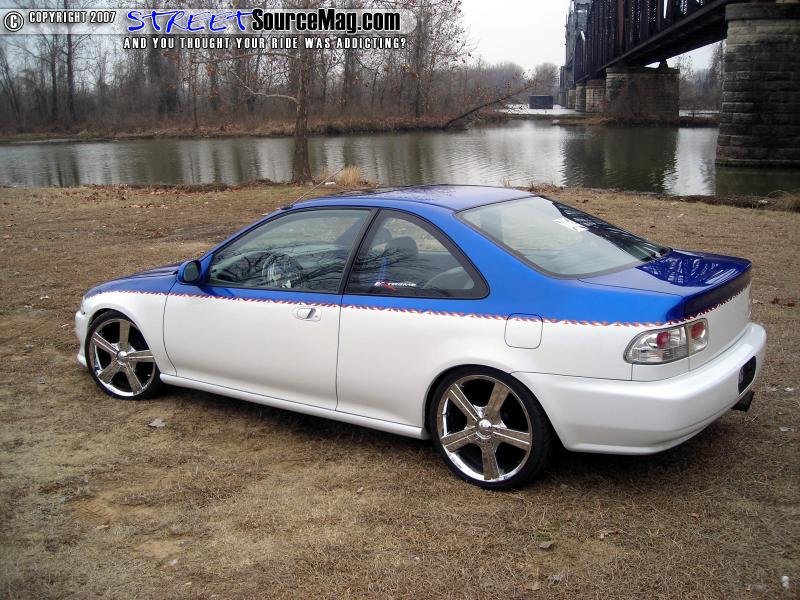 After several days of prep work by Tim and his partner, Steve Rogers was brought in to spray the Pontiac G6 blue and Honda white two-tone paint. Tim then broke up the colors by adding orange tribal graphics between the colors. Once all the paint and buff work was done, the exterior was finished with a sunroof, cat-eye style headlights and altezza taillights.