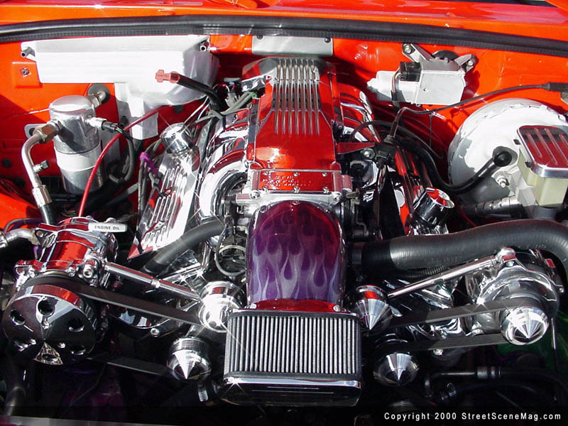 The crew from Carefree then laid a Kandy Tangerine by House of Kolor, over the entire truck. Next, they added the triple flames using white, yellow, orange, two different reds and purples, all from House of Kolor. The pinstriping was done with green, purple and blue applied by Wizard. Other notable exterior accessories include the Trenz grille insert and clear tails. In order to roll around to the shows and keep the engine looking as good as the rest of the truck, Jeff applied a few upgrades. A new water pump, alternator, pullies, valve cover, injectors, air cleaner and intake system all by Street & Performance were installed. Lots of chrome plating and polishing fill the engine bay while everything else is painted with flames and skulls visible throughout. A Boag exhaust system was also added to beef up the performance and sound of Jeff's V8.