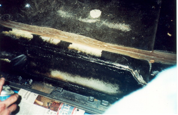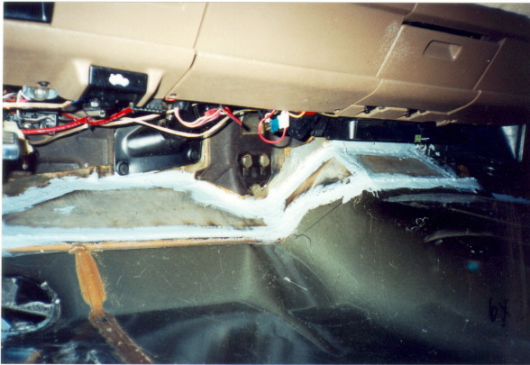 Then we move back to the firewall, where we begin tacking it up. Here is the driver's side completely welded up. Once we are satisfied that we have it all welded up, we seal all the welds with autobody seam sealer.   Next, a good coat of paintable undercoating is sprayed on everything to keep rust from starting.