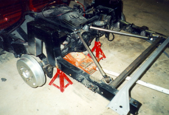 If you're satisfied with everything, put some really good tacks on every weld location and move the rearend through it's entire range of travel. Check for any binding and also the pinion angle. If any adjustments are needed, do them now and double check everything BEFORE you completely weld it up. Remove the bars and weld all the mounts, then add a coat of paint. When everything has cooled, reinstall the bars and the bags. Lastly, put the bed back on and trim the floor if necessary. The truck we used is a 1993 toyota reg-cab owned by brian dunn of memphis tennessee. We used a pete & jakes tri-angulated 4-link - the truck rolls 18" giovanna wheels and has 4-wheel bags w/ MIC fast manual valves. we only did the 4-link - not the bag set-up. tech work done by eric arrington & matt long @ KUSTOMWERKS - union city tn. kstmwrks@usit.net