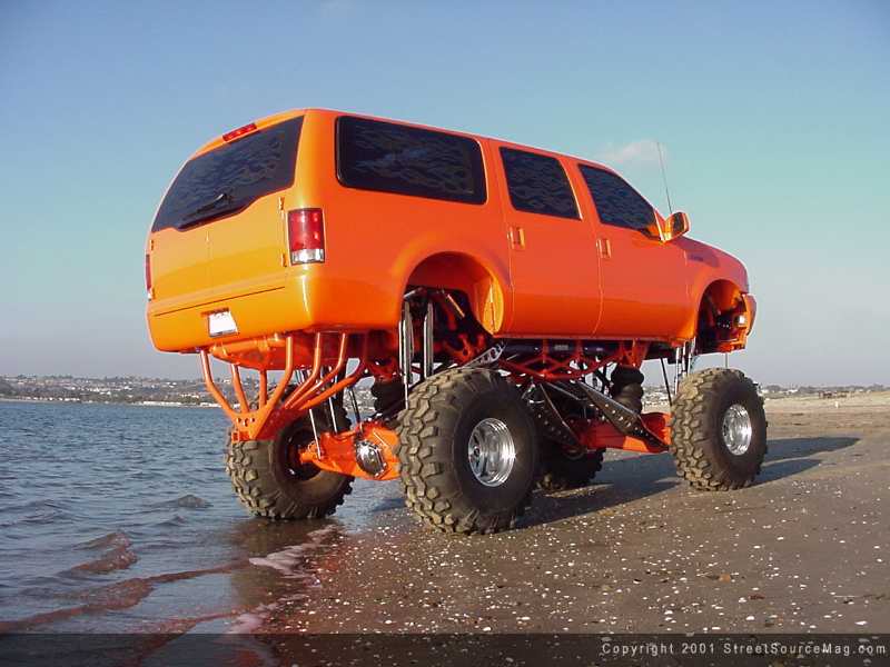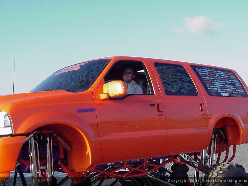 As with any ride, stopping is essential. But with a beast of a machine like this, it becomes more of a must than normal. To ensure stopping and turning ability with the 16.5x14 Outback Weld racing wheels, snuggled in 44x18.5 Denman Tire Super Swampers, Craig would turn to Aeroquip for help. To help manage this task, Aeroquip steel braided brake hoses and Boyce Equipment hydraulic steering lines were installed. Keeping the clean look underneath, Jim McGill at Ranch Muffler & Truck Accessories of Temecula, California was called upon to do the plumbing for the lines. To provide a few other touches of eye candy to the undercarriage, Craig contacted the crew from Street Glow Neon. You can find purple neon throughout Craig's Excursion, along with a touch of purple neon behind the grille. Karvision's of Temecula, California provided the wiring for the neon. If you look close enough, you can also find Craig's Grover Air Horn, providing heart attacks for the elder generation. MGM also supplied a set of plexi-glass mud flaps for an added twist to this custom.