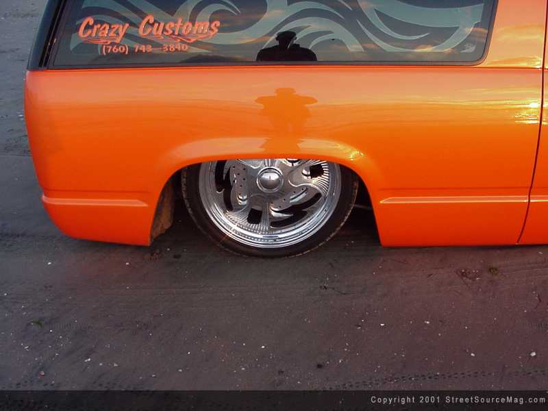 With the Tahoe laying body, a set of custom wheels were needed to set it apart from the rest. That came in the form of 20x8 Colorado Custom Rush wheels, which were wrapped in Michelin 255x35x20 rubber. Now ready to work the exterior, Wendy, with the help from Craig Elder, started replacing factory panels with more custom models. For starters, the front clip was replaced with a complete Cadillac Escalade clip.