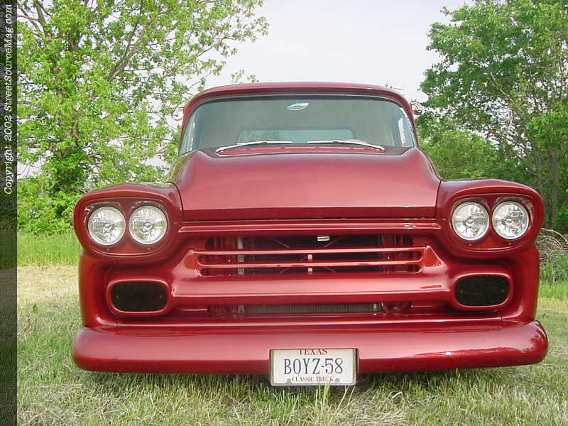 Adding to the body modifications Billy had the top of this 58' chopped 3" and custom glass installed to accommodate the chop. With the cab and fenders taken care off Billy decided to junk the factory bed and go with a 90's model step-side bed and adding to this Billy molded in a ZR-1 roll-pan, billet specialties step plates and a relocated gas neck behind the flip down license plate.  Once the bodywork was finished Billy had Legacy Paint and body of Garland Texas lay down the fire mist red paint in excellent fashion to bring this truck to life.