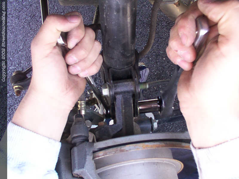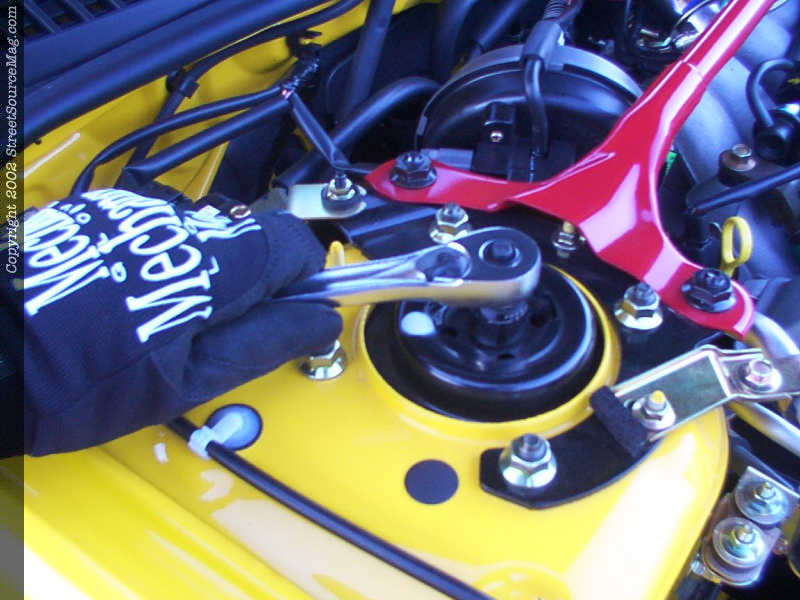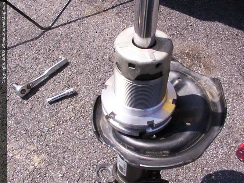 Here is what you get when you get a set of coilovers, four of each (springs, adjustable perches and spring caps) as well as a set of spanner wrenches. With the car on level ground and the emergency brake set, start with one corner at a time. Remove the center bolt from the strut tower. This releases the strut itself and leaves the top spring cap still bolted to the car. Then slowly jack up that corner. As the weight of the wheel, hub and brake assembly pulls down on the strut, it will pull the strut out of the strut tower and release the tension on the factory spring. This is where most people use a spring compressor, but if your limited on tools, this way works just as easy if not easier. Now that the top of the strut is free from the strut tower and the tension is off the spring, remove the wheel and set the car on a jack stand.