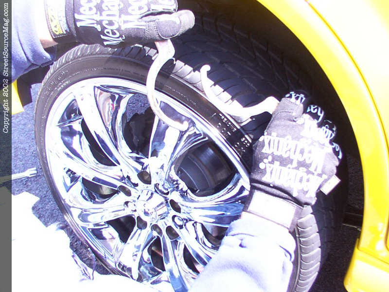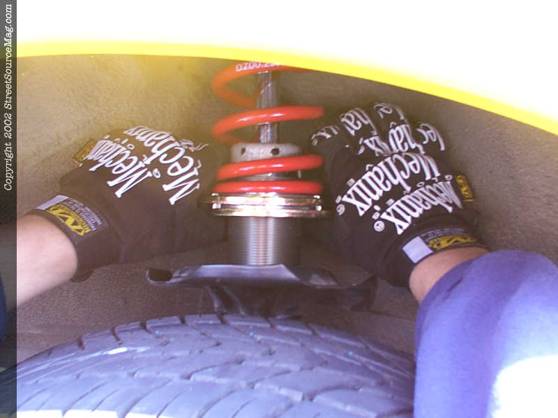 Put the adjustable spring perch over the top of the strut (non-threaded part down) and tap the strut cap back on to hold the spring perch in place. Slide the coilover spring over the spring perch and place the provided spring cap over the spring. Now reinstall the strut in the reverse order you removed it making sure to double check all bolts before letting the car down. Reinstall the wheel and slowly lower the car making sure that the strut goes back into the hole in the top of the strut tower. Once all the way down, reinstall the center bolt on top of the strut. Once the strut assembly is completely reinstalled, jack that corner back up and adjust the spring perch to the level you want the car to sit. Usually all the way up is good until you get all four corners done. Now work your way around the car until all the coilovers are install and the car is back level on the ground. It may take some playing to see what the best height will be for your car. Just hand tighten the perches until you are happy with the height of the car.