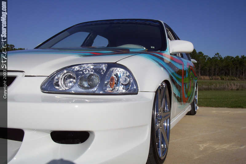 Once Allen had the Civic ready for paint he laid down numerous coats of Honda Olympic white paint to the body. Once Mitchell picked the car up from Allen he noticed that the plain white hue was not going to make the car stand out enough in the crowd so he called upon the artistic styles of William Boswell at Wild Airbrush in Columbus, GA to lay down the multi-colored airbrush theme over the entire body of the Civic.