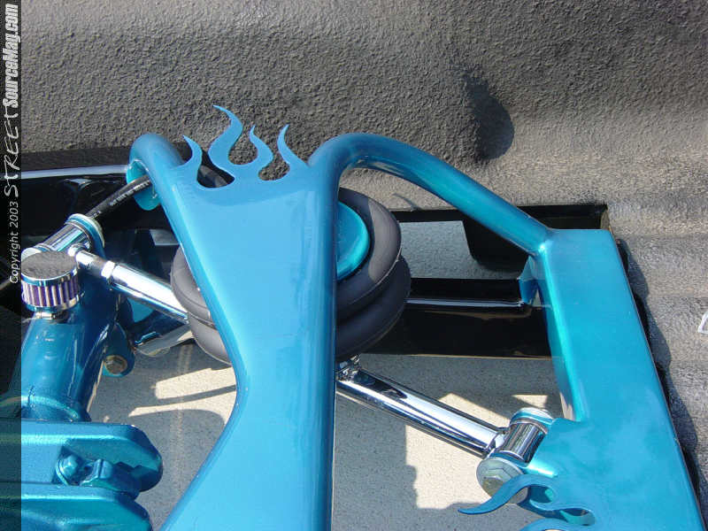 then paint the notch to match the truck as well as the drive shaft and rear axle. The rear paintwork was all performed by Denny. They also added a chrome Hack Shack 4-link to stabilize the rear end. Brackets were also welded to the rear clip to hold the air tank, compressors, ½ Parker valves and the red top Optima battery under the bed. A 15-gallon polished aluminum fuel tank was also added to the rear clip. To add lift to the rear a pair of 2600lb Firestone Airbags were bolted in along with a set of Pete and Jakes chrome shocks.