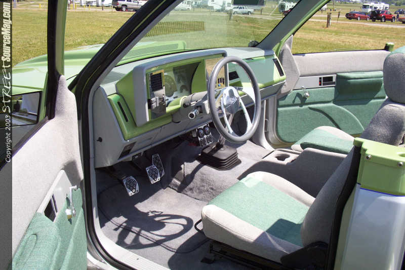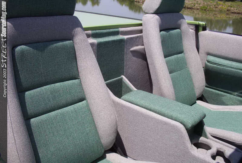 One of the final orders of business was the interior of the open air cruiser. Chico removed he dash and treated it to the same custom mixed Cyber Green as the exterior was treated to.   Moving to the seats Chico chose a set of Recarro buckets. The seats, door panels, and center console were delivered to the sewing skills of Auto Tailors in St. Peters, MO for them to ad a custom mixture of green and gray tweed.