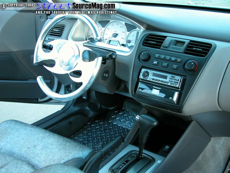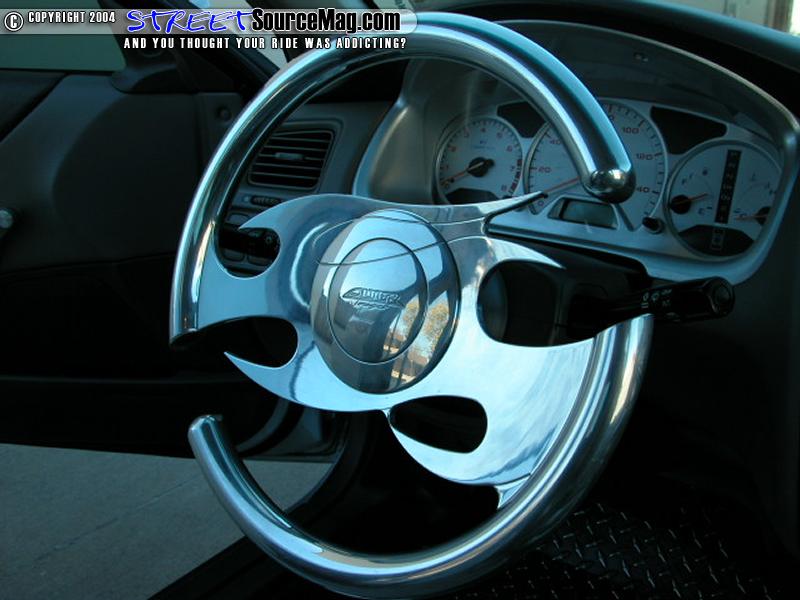 Aside the upholstery the stock steering wheel has been replaced with a billet tribal flame wheel and silver reverse Indiglow gauges have been installed. Mark has also had the interior of the car laid with dynomat and two layers of jute to encase the sounds of his high definition custom stereo.