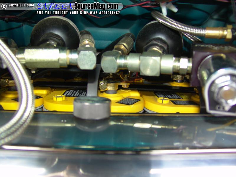 The front utilizes 6” cylinders while massive 10 inchers handle the back end and are all controlled by 10 switches. Chad hand built all four custom strut assemblies to be able to lay the car out. To make sure his Mazda still rode as close to the way it did when he bought it, he installed accumulators for all four corners. Power for this system is a handled by three yellow top Optima’s.