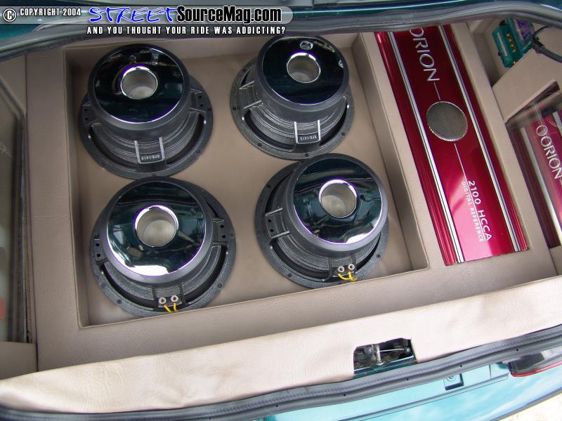 The vocal amp runs a pair Clarion component set up front and a pair of Clarion 6x9’s in the rear deck. The 2100 runs four Rockford Fosgate chrome Punch 10’s. The subs are mounted firing down into a fully sealed fiberglass enclosure. The amps, yellow top Optima for the stereo and Lightening Audio caps are all mounted around the subs. There are a couple Plexiglas windows with green neon behind them for effect lighting. All the trim panels are wrapped in beige leather that matches the interior.