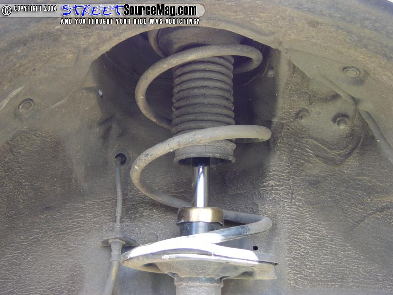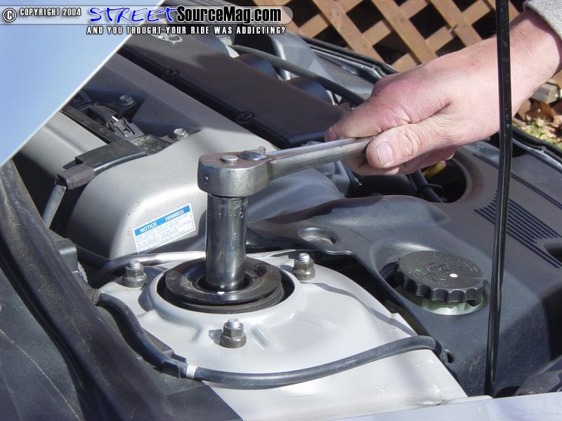 I recommend doing a corner at a time. Make sure the car is still sitting on the ground at all four corners before removing this strut nut. If you don’t have access to a lift and spring compressor, this is the best way to remove the strut. Remove the center nut from the strut. Once the top center nut is removed, slowly jack up that corner until the pressure is off the spring. This is where using the weight of the car as leverage comes in handy. With this top nut off, the strut itself will fall out of the top mount once all the weight is off that corner. Now that the top of the strut is loose and all the spring pressure is gone, jack the car up enough to get the wheel off the ground and remove that wheel. Now remove the two lower bolts on the strut. This is what holds the strut to the spindle. Be sure to unhook any brake lines, etc that may be hooked or bolted to the strut itself. Make sure you remove the sway bar end link from the strut using an Allen wrench and an open end. (There will be a picture of this on the reinstall)