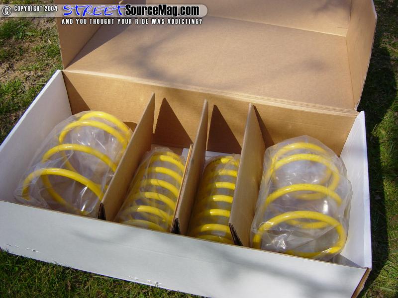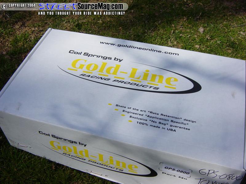 Here is the set of springs I chose for this project. 1.5” Goldlines. After securing the car and loosening the lug nuts, (we started on the front of the car) remove the top center cover from the front struts. Be sure to leave the wheel on the car. Its weight will absorb the spring pressure.