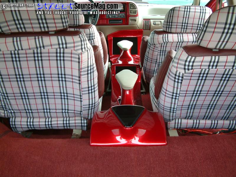 Trying to keep up with the exterior of the Tahoe, Greg would then turn his attention to the interior work. For starters he would paint the dash and vents to match the exterior along with wrapping the door panels in Burberry material.   Next the seats would be stitched up in the same Burberry material as the door panels to help tie things together. The stock bench seat in the rear would then be removed and replaced with two bucket seats.