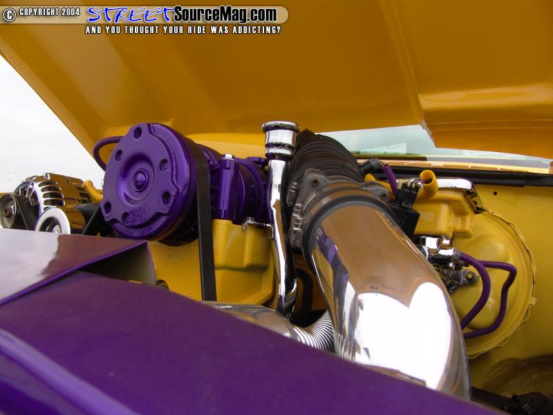 Since the motor was already out for the body dropped, Jerry and Amanda decided to do a little paint and chrome work to the 4.3 liter Vortec V6. The entire motor was painted with yellow and purple, while pullies and several brackets were chromed for a little shine under the hood. A polished intake and a few billet goodies were also added to clean up the engine bay a little.