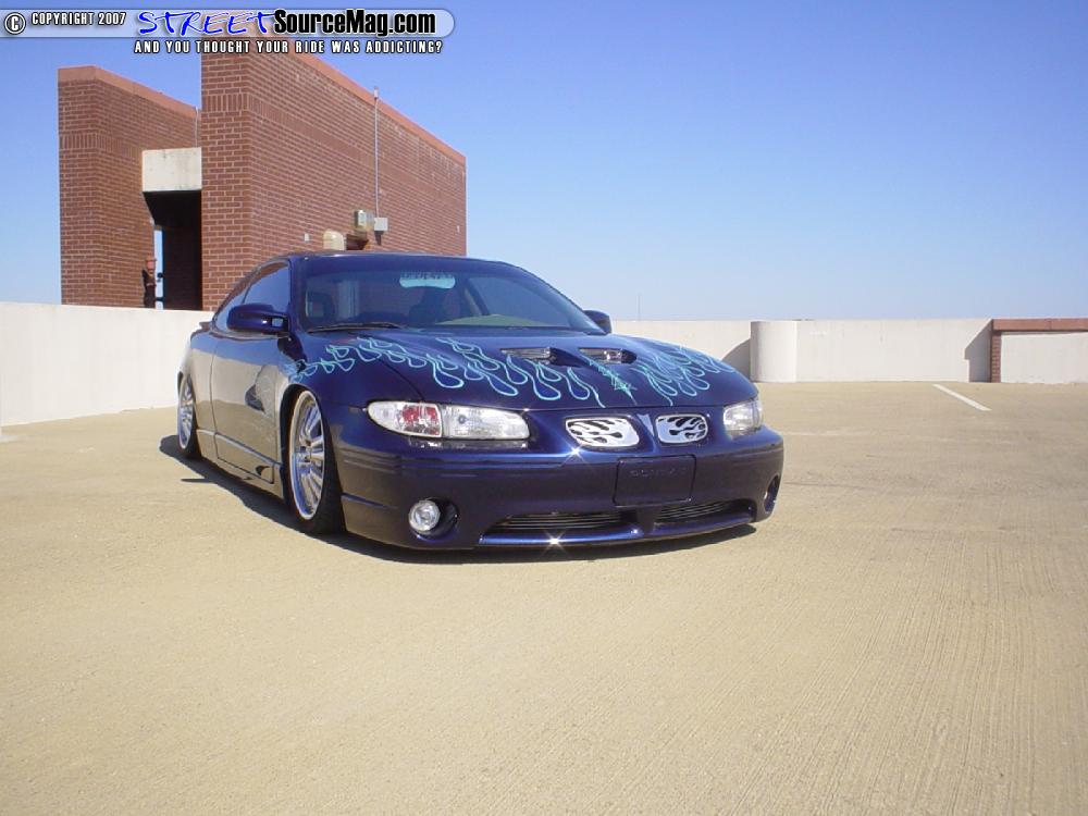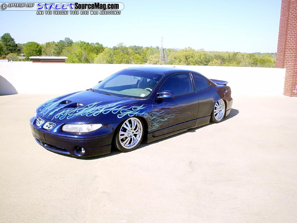 When it came time for the paint and bodywork, the choice was simple. Chad’s project would head over to Keef’s Rod & Custom in Sallis, Mississippi. With the American Sports Car Design GTX hood installed Keef went to work shaving the body smooth and spraying the Dupont Navy Blue Metallic and House of Kolor Ice Pearl. Before the clear coat went on, Keef then laid out a sick positive and negative flame design using Arrival Blue Metallic. The flames were finished off with some ghost images of trucker girls and chameleon shading. House of Kolor Lime Green was used to do all the hand pin striping. The rest of the exterior was dressed up using clear corner lenses and one of billet inserts in the hood, grill and bumper. The rear of Chad’s ride features an SLP GTX spoiler and cleared out factory taillights with led bulbs.