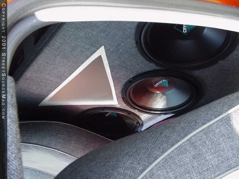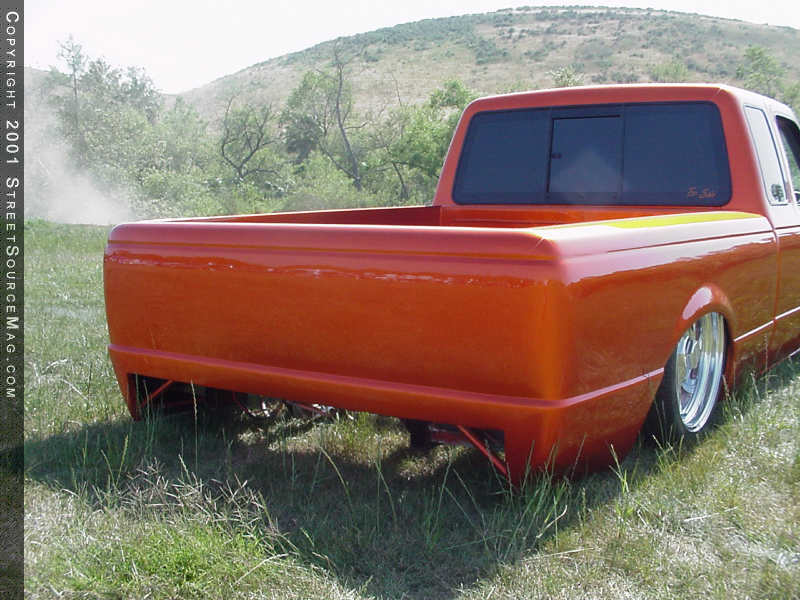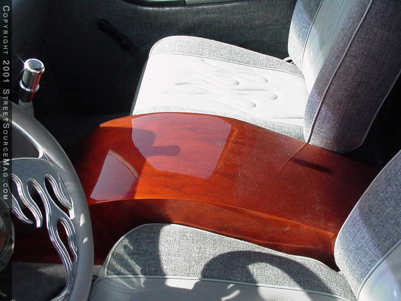 There is no show vehicle complete with out full interior and a kick ass stereo system. Knowing this, Ryan went to town on some of his own kick ass ideas. The first thing he would do would be to install a sweet system. The CD player of choice was a Pioneer deck. Through out the rest of the stereo, Crystal components where used along with four 10-inch subs, which are located in the extra cab. To accent the stereo, Ryan had a custom center console made and painted the same color as the truck along with ghost flames to accent it. To compliment the new center console, he installed a Weld Flames steering wheel.