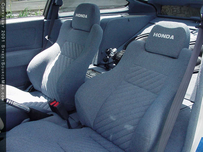 Brandon knew to turn heads and win shows he would have to make his CRX as clean as possible. Tommy Rickard from Asheville was called in to handle the task. Starting from the front and moving to the rear, Rickard shaved the door handles, emblems, squirters and antenna. Next, a Wings West RS Series body kit was installed along with a new wing. A mesh grille was installed in both the front and rear bumpers. To finish it off, clear corner markers and bumper lenses were installed. Finally, Rickard brought Brandon's CRX to life using Dodge Stealth Pearl White. No head-turning show vehicle would be complete without changing the interior and neither is Brandon's. He wrapped his dash and custom center console using Twilight Blue tweed. Adding to the interior, Brandon also had the seat and door panels covered in Twilight Blue tweed. The headliner and floorboards were covered, and Honda "H" raised in them for extra show points. The vents were painted white and Brandon installed a power window kit. Finishing the interior off, Billet Specialties "Revolver" steering wheel was installed.
