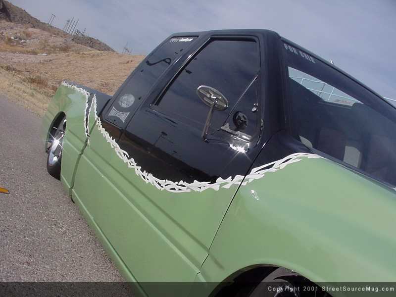 With the body laying on the ground and the suspension mods complete, it was time for Kevin to get busy on the exterior. Starting with the front of the Pup would require much desired work. Kevin's decision was to first swap out the front clip with one of an Isuzu rodeo. To do this, the stock hood, fenders and headlights would be set out for the trash man and the new panels would be bolted up. Kevin would next bolt up a billet grille into the new Rodeo chrome grille. With the hood squirters no longer, it was time to hit the cab to ensure the modifications make their way around the entire truck. Kevin would then have a set of Harley Davidson sportster mirrors mounted to give the truck a true pimp status. With the mirrors on the door, the decision was to remove the door handles to bring a smoother look about.