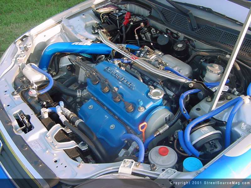 With the car looking show worthy it was time to beef up the little 4-banger to keep up with those on the Fast and the Furious. First off Levi junked the muffler and hooked up a Tenzo R cat-back system. With the car now sounding like a bumblebee, Levi strapped on an AEM cold air intake to get the engine some fresher air and a Tenzo strut bar to keep the corners tight. Along with the Chrome intake and strut bar Levi has plenty of wire loom and Doughboys to make this a show-winning engine.