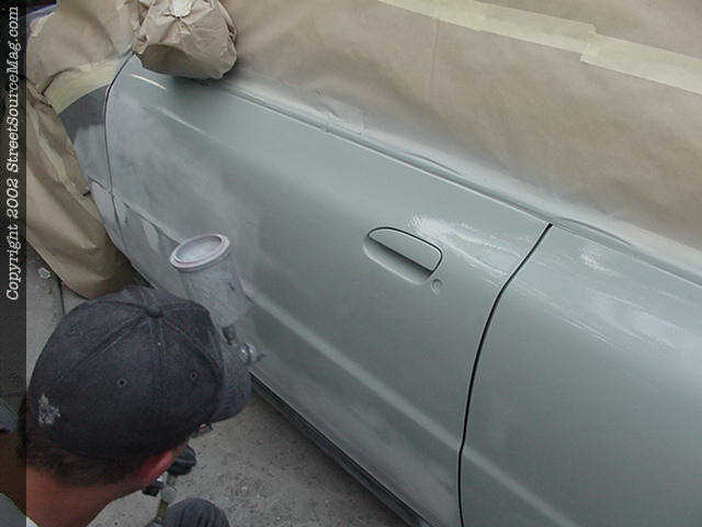 9. Before primering the doors remember to sand the entire door down or the spot you want primered ensuring a good bond. 10. With the masking complete, we chose to primer the entire door since the bottom half needed primer cause of the shaved moldings. Work done by:Waldo's Custom's and RestorationJohn "Waldo" Bartels208-283-3305
