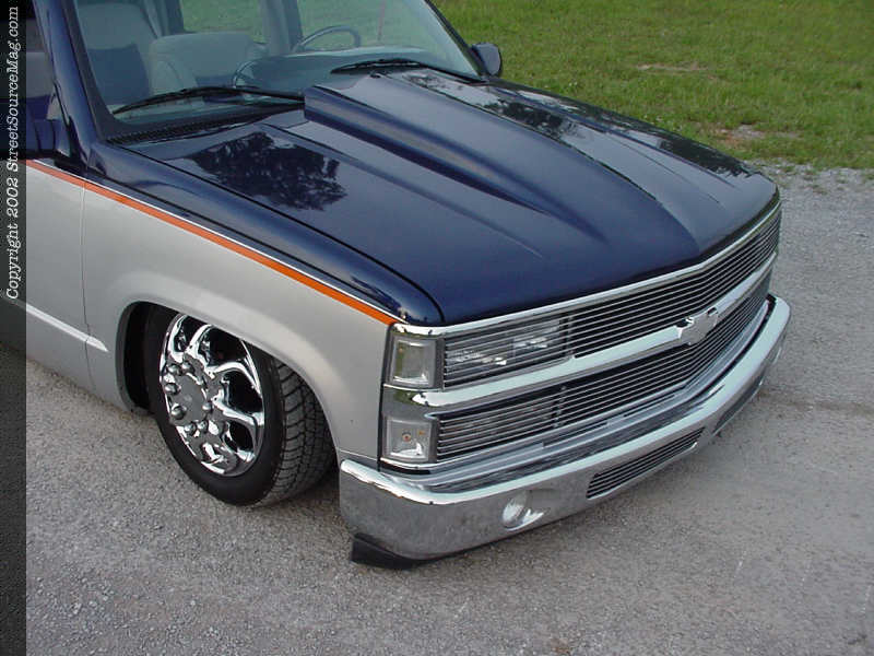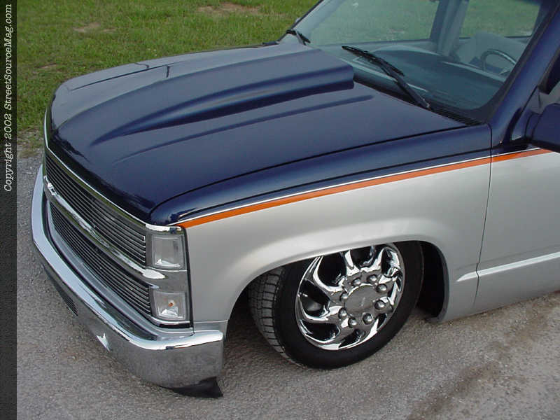 The new mods gave Nelson's dually a new look, but KUSTOMWERKS was not quite finished. Next, they shaved the door handles and the antenna and installed a Precision bumper and phantom grille shell.  The factory hood was removed and a steel cowl induction hood now resides in its location. To allow the hot Tennessee sunshine into the cab, KUSTOMWERKS installed a massive 40"x55" Street Beat sliding ragtop. The body mods were complete and the truck was prepped and ready for paint.