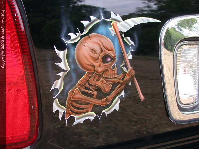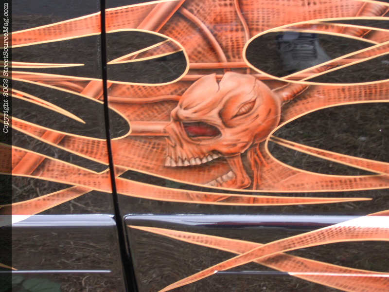 Through out the copper colored flames you can find numerous amounts of airbrush work with skulls and many other eye-catching items. To help bring out the tribal work, Spiders decided to out line the work with yellow pin stripping.