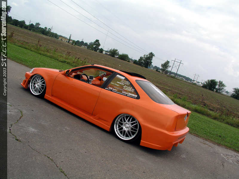 Luke had always been into Mini Trucks. He had built a slew of body draggin minis and was just willing to prove a point to everyone out there that said "You can't make an Import Custom". Well we think Luke has done an outstanding job of breaking down the walls and preconceived notions that all Imports are not custom. Luke started with a bare to the bone 2000 Honda Civic with as few extras as he could find. Luke's theory was the more it has that's just that much more he would have to remove. So when he found his Honda in the spring of 2001 he was off to prove a point and dispel as many prejudices as possible. The first order of business was to strip the car down to the bare uni-body. The motor was pulled as to gain access to the firewall and provide more room to work on the custom aspect of the car. While the motor was out the firewall was treated to the same treatment the exterior would be receiving.