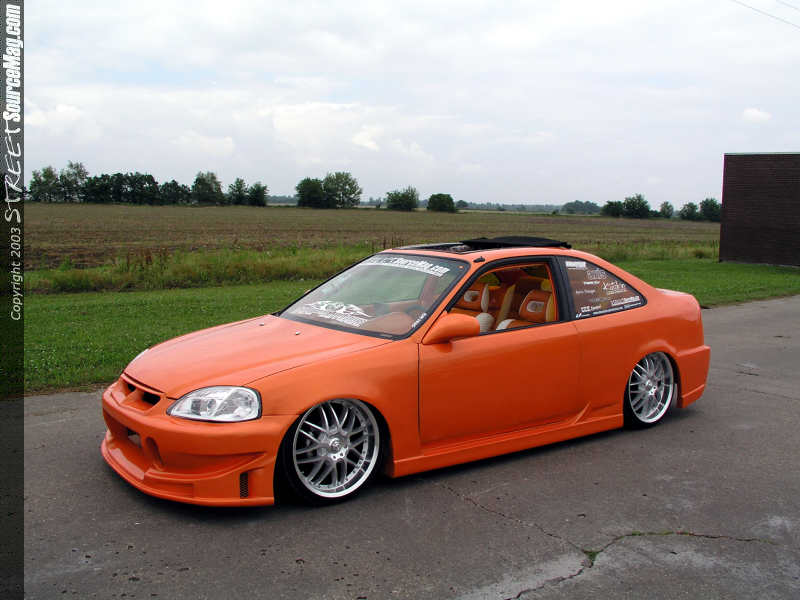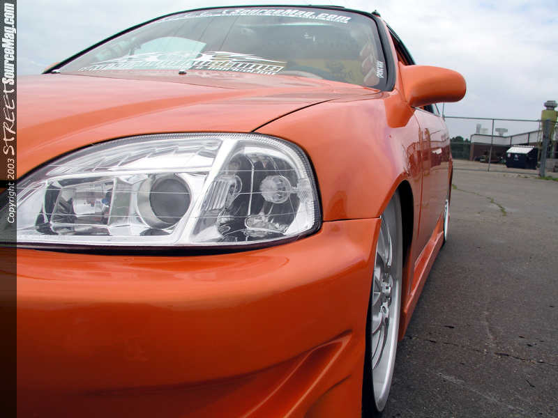 Luke went over the entire car multiple times wet sanding and re-priming the car until it was in mint condition. With the body now ready to accept it's new hue Luke and the crew laid down generous coats of Lamborghini Orange from PPG. Once the body was dry projector headlights were installed into the front clip. In true mini trucker fashion Luke installed a StreetBeat sliding ragtop into the skyline of the Civic.