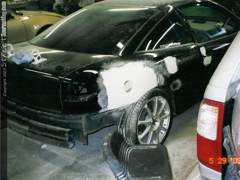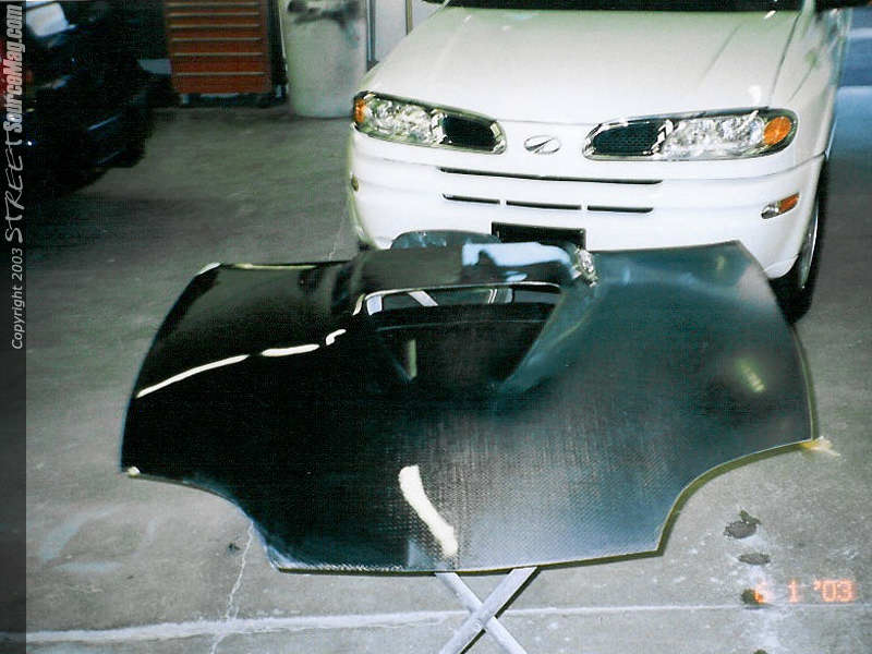 PorkChop had to straighten out the crotch rocket gas door (not quite done right by somebody who will remain nameless). Now it is blocked and ready to rumble. Here is where we get to the good stuff!! The carbon fiber flames are... well... SICK!First he wet sanded the hood with 500 Grit.