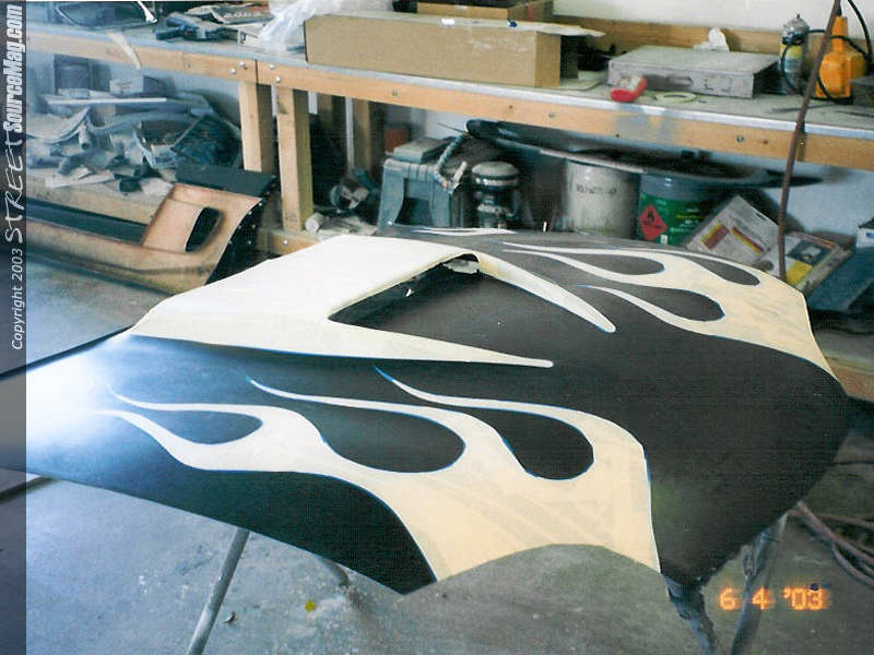 PorkChop with DA, interface pad, 500 grit sand paper, a bottle of water, and a big penis (it's in there, look close, haha) Porkcop goes nutts with some badd ass flames fine lined and masked off. Porkchop does the same thing with the trunk lid.