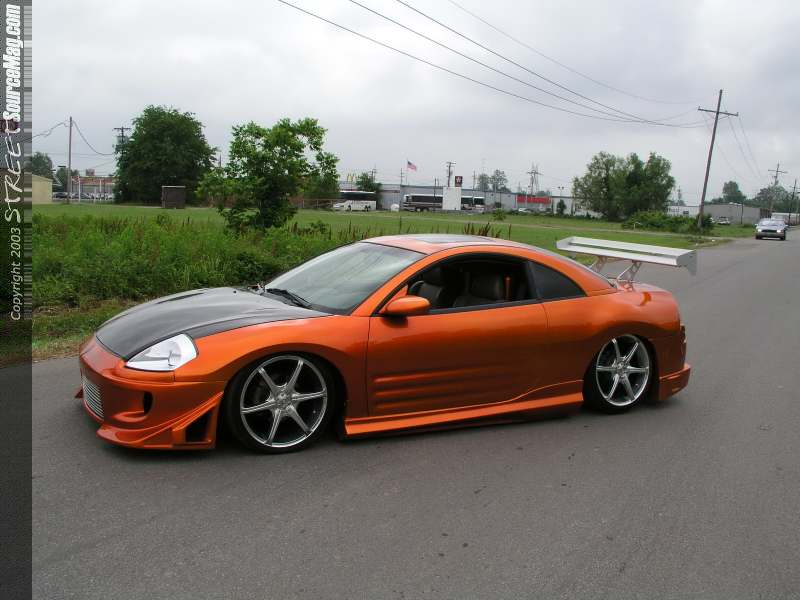 The next item to grace the Eclipse was a new carbon fiber hood and a custom one off grill. An aluminum wing was then added to the rear deck lid to apply the down force needed to keep the Eclipse firmly on the tarmac, and to look good too. Now that the body was in order it was time for an altitude adjustment to the Eclipse. Jay called and ordered a set or strut bags for the front and a set of Firestone 2500's for the rear. Once the adjustable were installed a Viar 450 was called upon to supply the needed pressure the system needed to get the car off the ground.  A three-gallon storage unit was properly hidden out of sight in the wheel well and (4) ½" Parker gold Valves were plumbed with ½" line to get the pressure to its proper place. With the suspension now in order Jay ordered a set of Konig Verdicts in the form of a 19X7 shod with 225/35/19 shoes from Yokohama Parada's.