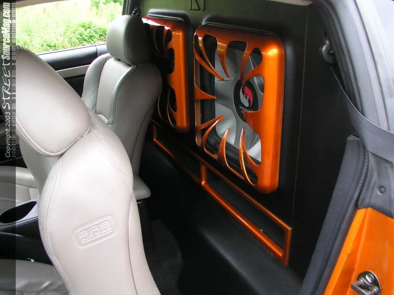 Once the wall was in place it was treated to black leather. To supply the tunes an Alpine head unit was installed in the dash were the factory control unit once resided. To ensure that the subs didn't drowned out the vocals a set of Kicker Comp 6 ½" mids and 1" tweeter separates were installed in the factory locations.