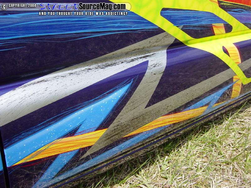 While the interior was stripped out to allow the graphics to be ran into the doorjambs, Nathan took this time to get the interior up to par with the new paint job. Most of the interior panels were wrapped in purple tweed and tan vinyl.  The stock seats were thrown out for a new set of Oldsmobile Brevada buckets. The door panels, headliner and seats all had flames sculpted into them before the material was put on.
