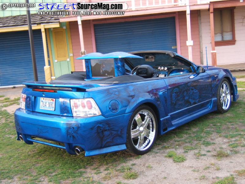 From a distance, as Brooke cruises this drop-top Mustang down the strip, the only thing you notice the wheels, twenty inch D’Vinci wheels wrapped in 255-35-20 rubbers. As the car draws closer the next thing you notice besides the thumping stereo is the paint but it isn’t until it is completely next to you that you notice the wicked airbrushing that covers Brooke’s Stang from head to toe.