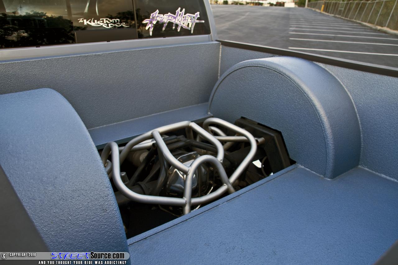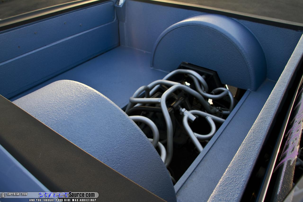 Potter and Robert "Robbo" Crowell started the cutting process in the rear of the truck. They stripped all the stock suspension off and started building a complete custom back half. 2x4" square tubing was used for the frame rails and a bag on bar set up was designed to work with a triangulated wishbone three link. A removable custom bent tubular bridge was built and powdercoated. The rear axle ended up being narrowed a total of 10" to tuck his new chrome 24" Boss wheels. Next they moved up front where the suspension would be a bit more difficult. They started by "Z'ing" the frame 2 inches. Then they built upper control arms with uniballs, raised them 5 inches, and narrowed them 3 inches from the stock length. The lower custom tube control arms were shortened 1.5 inches. McGaughy's spindles were added along with Slam Specialties bags on the front and rear. Everything was hard-lined with 1/2" aluminum lines. Dual Viair 444's, Viair gauges, two 3 gallon tanks, and an AVS brass knuckle switch box round out the air management. And just for some added fun train horns were thrown in. The bodydrop was next and began with a 2 inch channel, lowering the body mounts and front frame horns 2 inches, and tubbing the floor for transmission/driveshaft. This resulted in a brand new Dodge laying rocker.