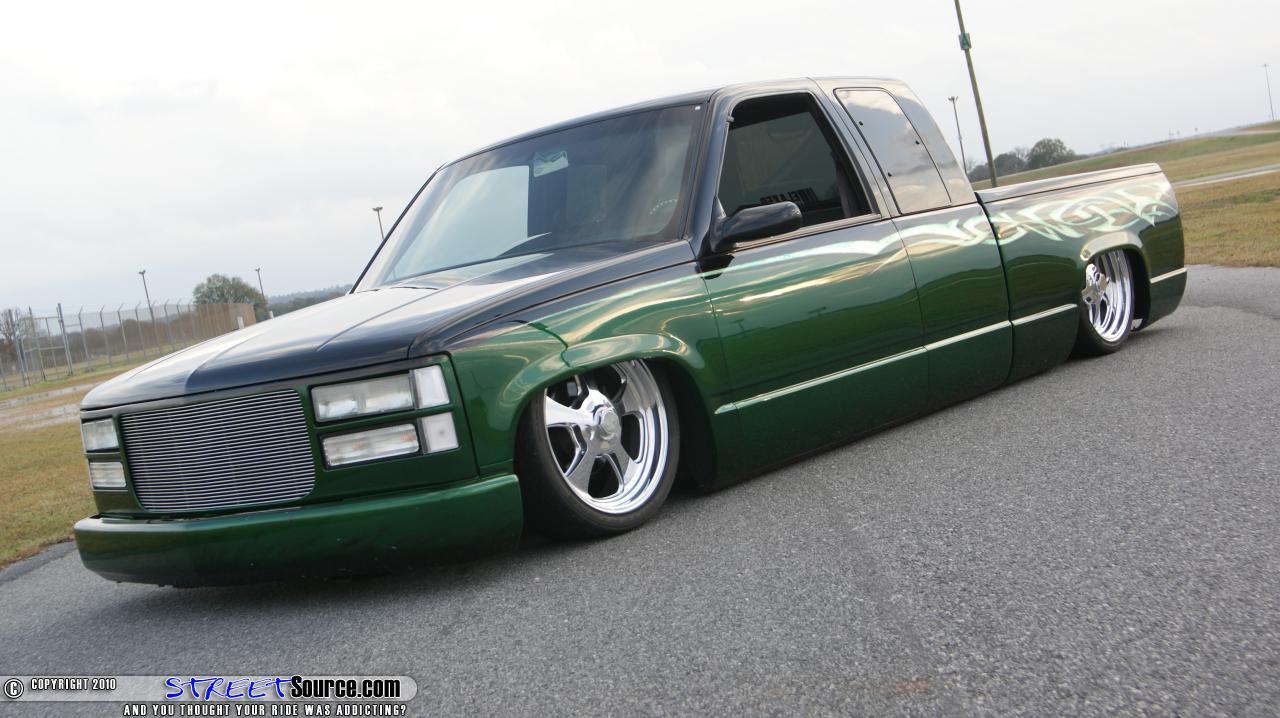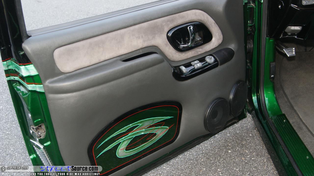 Although this truck has always been easily recognized by its smooth body and unique green and black two tone paint scheme, it too was showing its age. One of the doors and the inner bed floor began to have serious cracks in the body filler, along with other blemishes from use over time. Although it hurt to tear into such a nice paint scheme, Mellon stripped the door and redid all of the metalwork to both straighten and greatly reduce the amount of filler in the door. Moving along to the bed floor, Mellon began finding other areas that needed attention as well. But beyond the body and suspension work, the interior on the truck remained immaculate. The dash and door panels are still remnants of the original “Evil Twin” paint scheme while the other interior panels were wrapped in medium graphite leather and suede by Mike Sutton in Long Beach, California. Even more impressive is the ground-pounding system installed b y Ghetto Bob at 702 Motoring. The custom fiberglass box and floating center console house four 10” Orion subs while the custom fiberglass amp rack houses the Orion amplifiers. Two HE800 Kinetik Audio Powercells provide the juice to keep this system pounding.