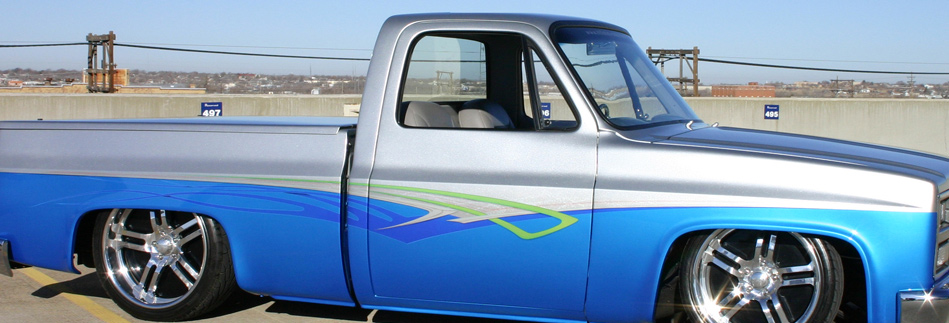 Doane’s C-10 was taken to Hills Hot Rods in Lubbock, Texas for Jason Hill to put his signature on it. Doane’s truck was outfitted with shaved door handles, custom tail lights, ‘91 Suburban grille insert, along with Suburban headlights, and a Suburban rear bumper. Hill painted the truck blue and silver with orange, red and blue pinstriping. He also added his one off water effect along with flames, shadows and chrome trim.