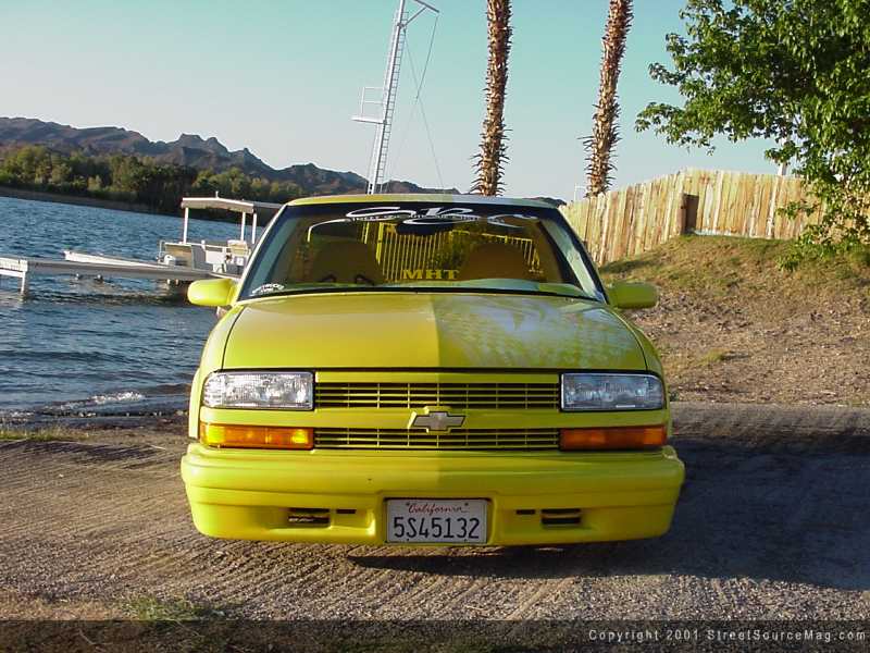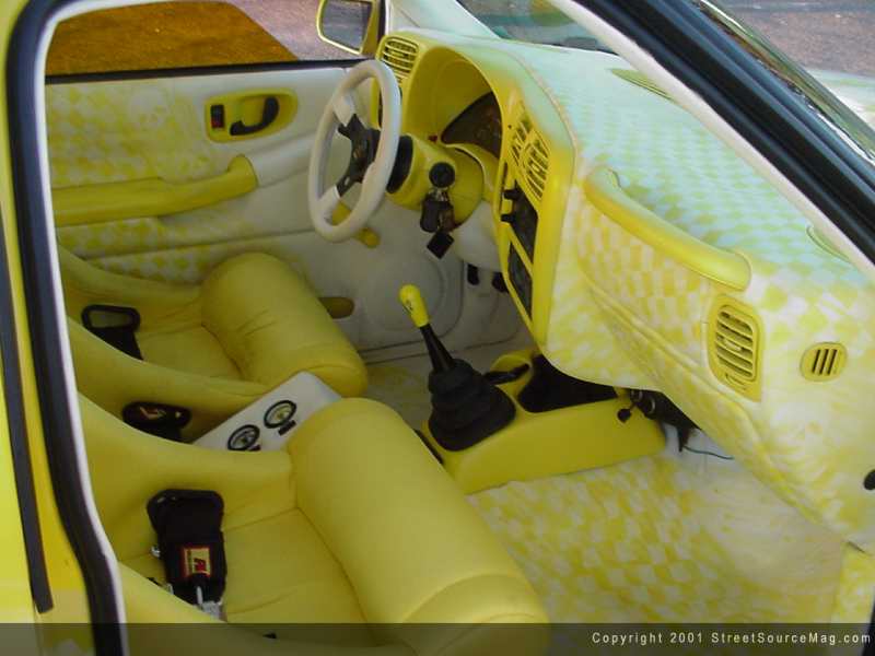 Now that the exterior was completed, it was time to get jiggy with the interior. The dashboard was covered with white leather and matching painted graphics. To fit in with the rest of the truck, the vents and miscellaneous dash accessories were also painted yellow. The Center console, which is painted to accent the interior and exterior, houses the AirLift airbag gauges and controls.