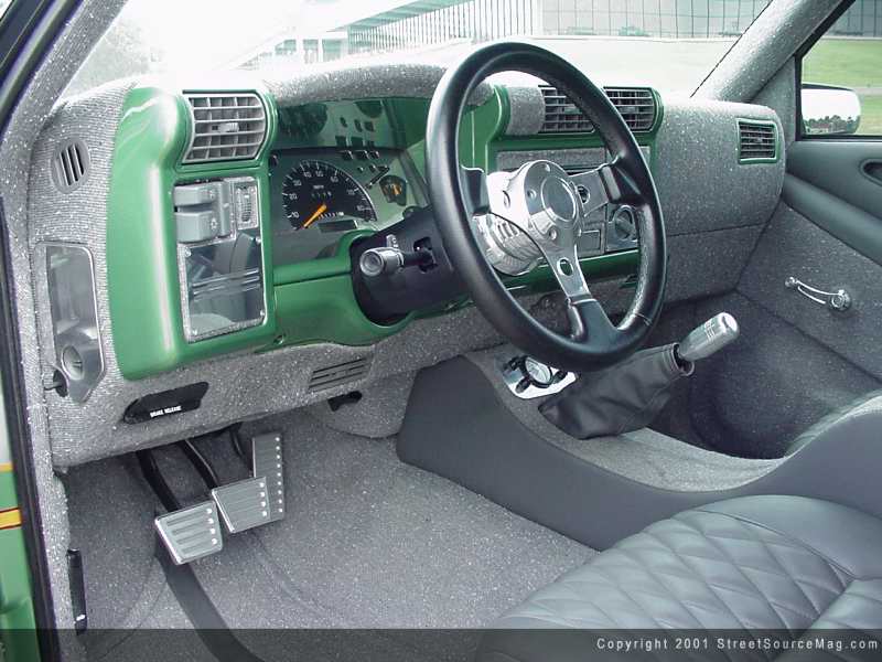 After completing the body and paint of his Sonoma, Brandon moved to the interior. He found a pair on bucket seats from a Saturn and had them recovered in grey tweed and vinyl. Everything including the floor, dash, headliner and other pieces and parts have also been covered with grey tweed or vinyl. The trim around the gauge cluster and vents have been painted to match the truck and billet pedals and dash inserts were installed. A Grant billet steering wheel finishes off Brandon’s interior. The owner and the owner’s father, Vic McDonald, accomplished all interior work.