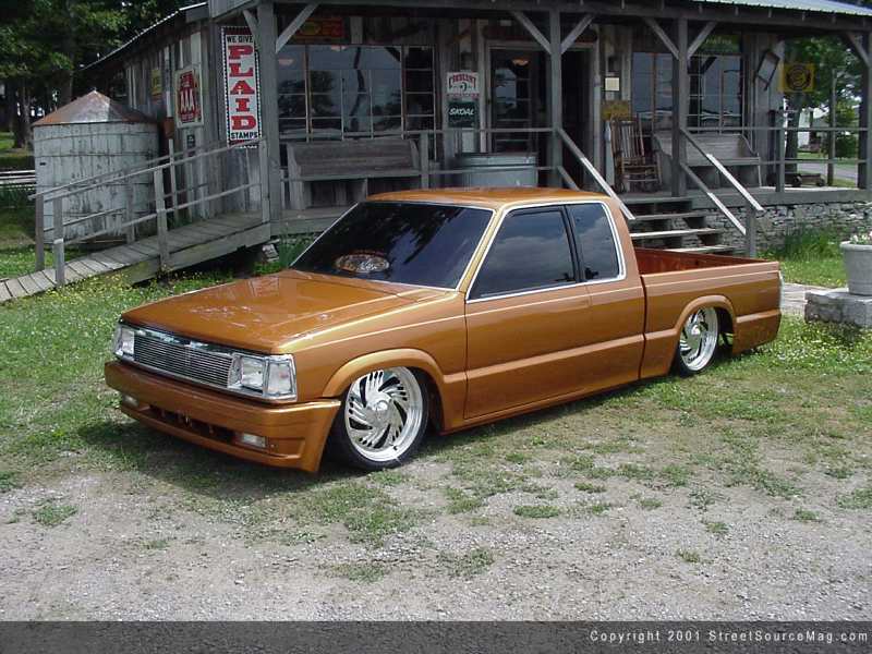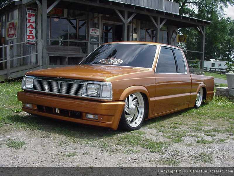 Chris first contacted Eric at Kustomwerks in Union City, Tennessee for a little altitude adjustment. Eric and his partner is crime, Strip, went to work. In the back, a Ford Courier rear-end was utilized along with a Pete And Jakes 4-link to create a cantilever-style rear end with the Firestone airbags actually mounted on top of the 4-link. Custom tubing was cut and welded in throughout, this gave Chris’s Mazda a truly one-off look. Up front, lowered control arms with yet another one-off setup was created, with the bag being mounted on top of the upper control arms. Kustomwerks also built a custom sway bar for Chris’s Mazda. To make things look nice and pretty, all original welds were smoothed and braided brake lines were added. To get Chris’s Mazda off the ground quickly, Kustomwerks installed their very own fast bag valves. With the suspension the way Chris wanted it, he decided body mods and new paint were in order to keep the ball rolling. A new smooth look was in order to give Chris the look he was striving for. Any and everything was shaved. The bumper holes were filled in to start with. Next, the wiper cowl, emblems, mirrors, door handles, gas door, bed seams, and tailgate handle. A steel roll pan was molded in and the tailgate was completely closed. Several people were responsible for Chris’s body mods, including Jeff Pfifer, Shane Wickham and Eric at Kustomwerks.