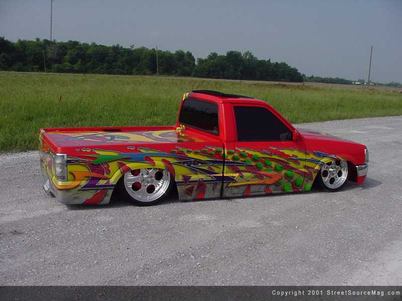 You see, Lance gives his buddy Ty full credit for what you see before you. Anyone who's in the show scene knows some of the history of this truck. But that doesn't take away from what's so special about it. This truck is just as special to the scene today as it was several years ago when it began its creation. Starting out, this 1989 Mazda B2000 had to be set to a comfortable level. In order to do this, a 2 ½ inch body drop was performed, lowering the body down over the frame rails quite nicely. In order to lift the truck from it's laid out state, Firestone airbags were installed at all four corners, utilizing large 3/8" line and fast electric valves in the 3/8" variety. In the rear, a custom c-notch and 4-link allow the Mazda to lay completely out.