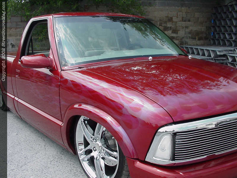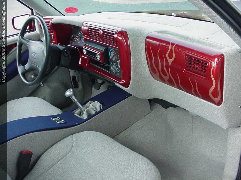 Being around friends that know a thing or two about show rides, John grew to the scene knowing that heads wouldn't turn till the interior was complete. Keeping this in mind, John himself took on the task of wrapping every panel possible. Utilizing gray and blue tweed through out the interior along with color-matched paint from the exterior, John would cover the dash, door panels and anything else imaginable.