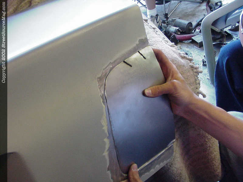 4. Helping to get the correct curve in the bodyline, John put to inch and a ½ slits to get the upper corner to bend correctly before starting his welds. 5. Happy with the fillers, it is time to start tacking to sheet metal into place. 6. The bottom of the filler didn't quit won't to roll as we liked so it was pulled out with a set of pliers and then tacked into place as liked.