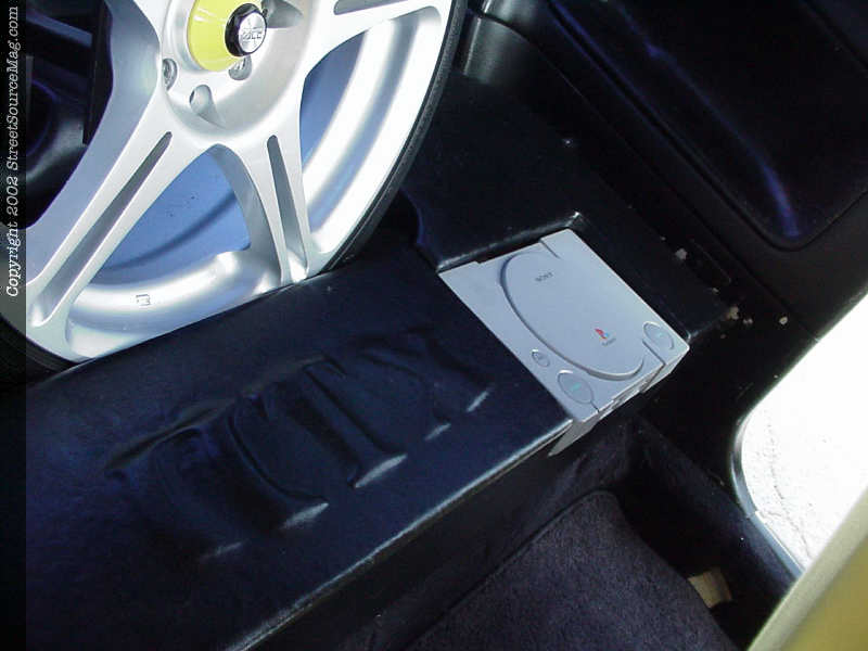 Keeping with the custom appearance, the rear seats would be removed completely. The dash would then be accented with a carbon fiber dash overlay and the vents would be painted yellow. Regan would then ditch the stock gauges for a set of APC indiglo gauges, and the rear view mirror would then be replaced with a video monitor. The interior not yet complete, Regan would now leave his Integra in the hands of Extreme Customs for some video and audio expertise.